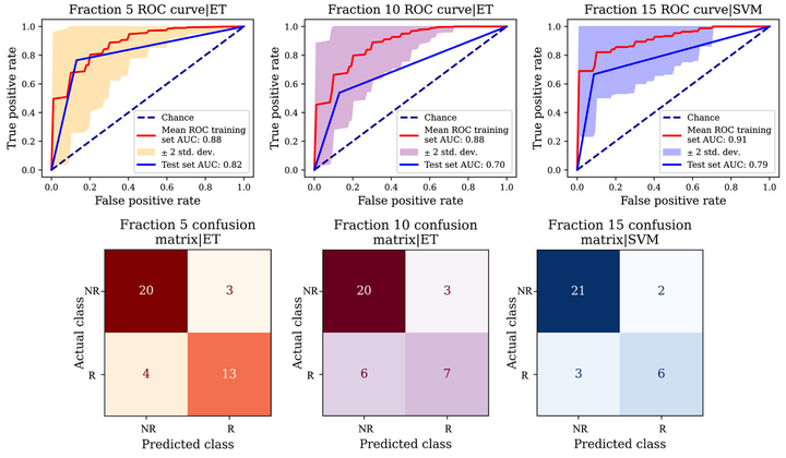 Results: Univariate analysis showed that body- and neck-related metrics were most predictive of replanning need. Our best specific multivariate models for fractions 5, 10, and 15 yielded testing scores of 0.82, 0.70, and 0.79, respectively. Our models early predicted replanning for 76% of the true positives