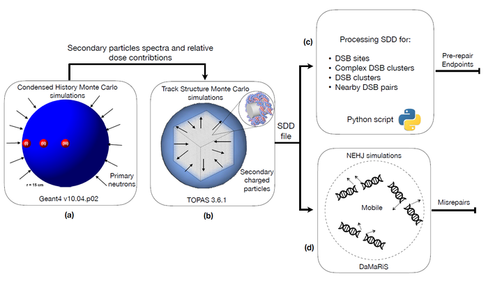 Image credit: John KildeaA comprehensive understanding of the energy-dependent stochastic risks associated with neutron exposure is crucial to develop robust radioprotection systems. However, the scarcity of experimental data presents significant challenges in this domain. Track-structure Monte Carlo simulations with DNA models have demonstrated their potential to further our fundamental understanding of neutron-induced stochastic risks. To date, most track-structure Monte Carlo studies on the relative biological effectiveness (RBE) of neutrons have focused on various types of DNA damage clusters defined using base pair distances. In this study, we extend these methodologies by incorporating the simulation of non-homologous end joining (NHEJ) DNA repair in order to evaluate the RBE of neutrons for misrepairs. To achieve this, we adapted our previously published Monte Carlo DNA damage simulation pipeline, which combines condensed-history and track-structure Monte Carlo methods, to support the standard DNA damage (SDD) data format. This adaptation enabled seamless integration of neutron-induced DNA damage results with the DNA Mechanistic Repair Simulator (DaMaRiS) toolkit. Additionally, we developed a clustering algorithm that reproduces pre-repair endpoints studied in prior works, as well as novel damage clusters based on Euclidean distances. The neutron RBE for misrepairs obtained in this study exhibits a qualitatively similar shape as the RBE obtained for previously reported pre-repair endpoints. However, it peaks higher, reaching a maximum RBE value of 23(1) at a neutron energy of 0.5 MeV. Furthermore, we found that misrepair outcomes were better reproduced using the pre-repair endpoint defined with the Euclidean distance between double-strand breaks rather than with previously published pre-repair endpoints based on base-pair distances. The optimal maximal Euclidean distances were 18 nm for 0.5 MeV neutrons and 60 nm for 250 keV photons. Although this may indicate that Euclidean-distance–based DSB clustering more accurately reflects the DNA damage configurations that lead to misrepairs, the fact that neutrons and photons require different distances raises doubts on whether a single, universal pre-repair endpoint can used as a stand-in for larger-scale aberrations across all radiation qualities.
